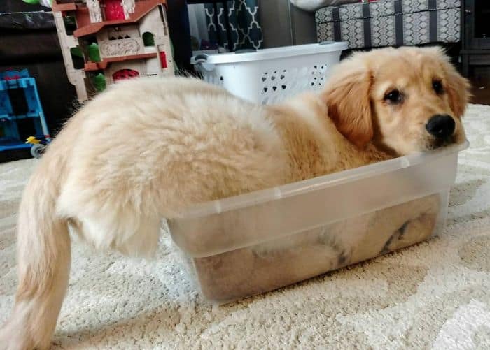 #16 My Girlfriend’s Golden Has To Bring A Gift To Anyone Who Comes To The Door. If She Can’t Find A Toy, She’ll Grab Her Whole Bed And Drag It Across The House Or Pick Up The Shoe You Just Took Off And Give It Back To You