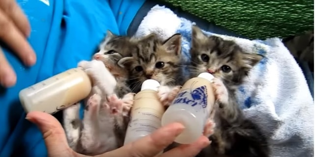 In this video, sweet kitten triplets are smacking down their bottles, eager to fill their tummies. Although Rocky, Sweet Pea, and Johnny have begun to eat with the older kittens, they are still very enthusiastic about bottle time. Don’t you just love how they hold their bottles with their little paws?! Cuteness overload!