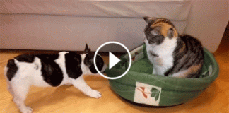 This Cat Stole This Puppy’s Bed. His Effort Of Reclaiming It...