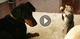 This Tiny Kitten Is Trying To Show That Big Doberman That...