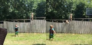 Cute Little Boy Loves Playing Fetch Over the Fence with Neighbor’s...
