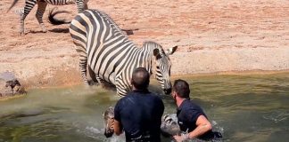 Heroic Zookeepers Dive Into Water Hole As Newborn Zebra Starts To...