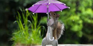 Squirrel Poses Adorably With Tiny Umbrella On A Rainy Day