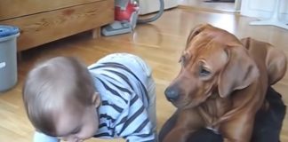 Rhodesian Ridgeback Sweetly Helps Baby Climb Into Dog Bed