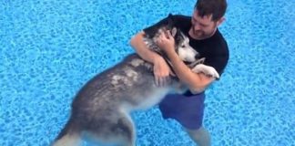 Man Lovingly Eases Senior Husky Into The Pool To Comfort His...
