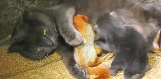 Mom Cat Feeds Her ”Kittens”, Lifts Her Paw And Shows What’s...