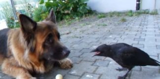 German Shepherd And Crow Play Fetch Together