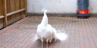 Beautiful White Peacock Fully Furls Open His Tail