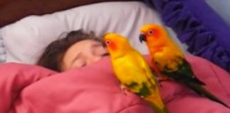 Two Noisy Parrots Approach Their Sleeping Owner – The Way They...