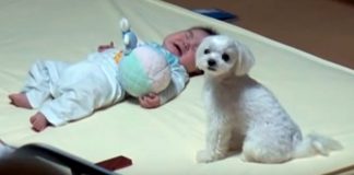 Tiny Baby Can’t Stop Crying, Then Mom Sees Dog’s Hilarious Reaction...