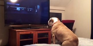 Bulldog Is Watching Horror Movie. Her Reaction When She Senses Characters...