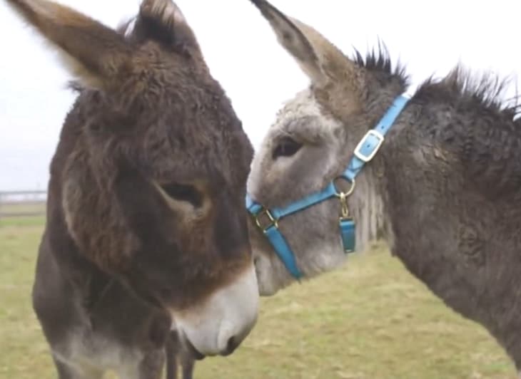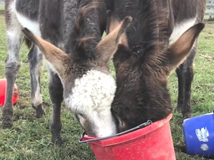 The two let out cries of joy and were “talking” donkey to each other nonstop. Since the reunion, Mary and the Colonel are practically joined at the hip. They love to eat carrots together, and even though they each have separate feed buckets to nibble from, they insist on stuffing their snouts into the same one! Janine says the closely knit pair always keep each other near.