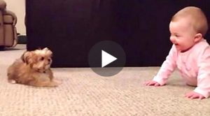 Young children and pets often grow up side by side and become best friends. This video is a great example of the beginning of such a relationship.