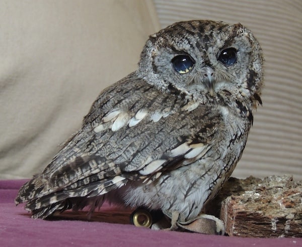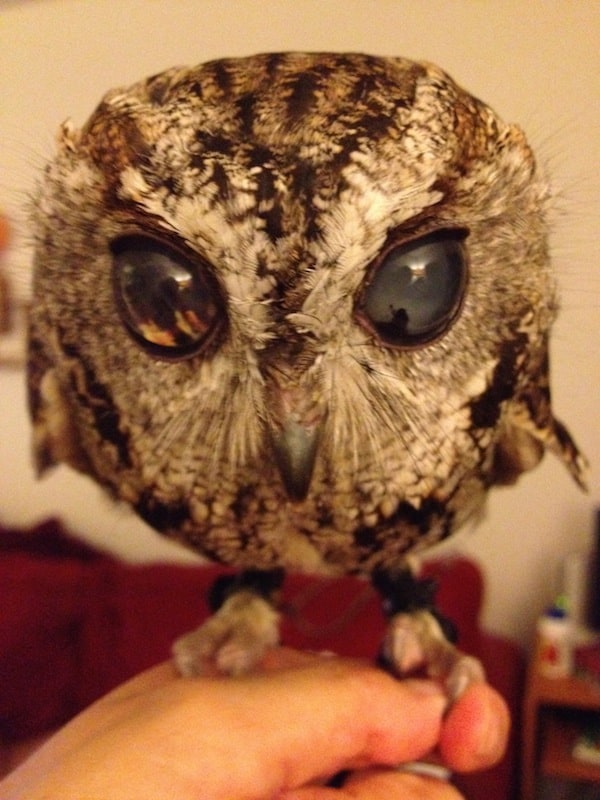 The Western Screech Owl was found injured and emaciated on the front porch of a home in South California in 2012.