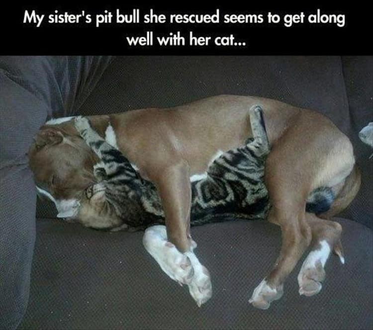 “My sister’s pit bull she rescued seems to get along well with her cat.”