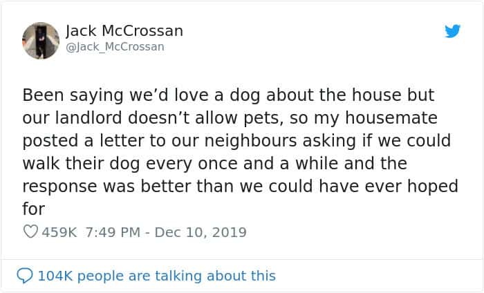“We appreciate how difficult it can be owning a dog whilst renting and feel that a positive, friendly and approachable local community is vital,” he talked about the importance of being friendly neighbors. “So if we can share the love a dog gives all the time we should try to follow in her footsteps. We’ve been amazed at the positive response we’ve received from around the world. It’s inspired other people to make contact with their neighbors and share their dogs.”