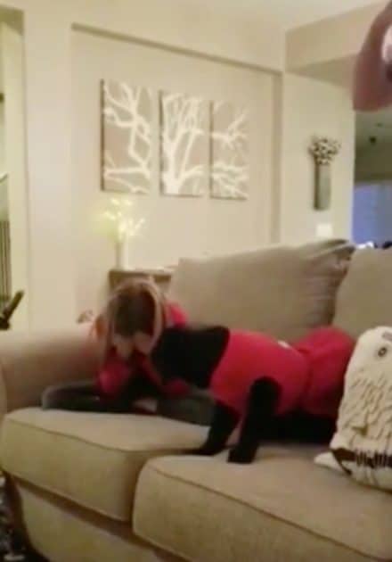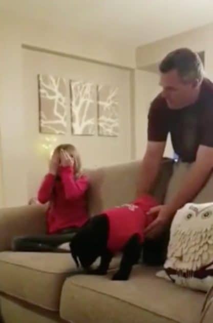 With Emma sitting on the couch on Christmas morning with her eyes closed, her dad snuck in and put her new Labrador puppy on the couch. When Emma opened her eyes, she started to cry tears of joy.