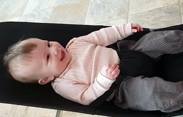 Mom straps her adorable baby girl into her bouncy seat. Safe and secure, the baby girl gets a wide view of the entire room. Prince trots over to say hello. The baby’s smile says it all! You can see that this little girl LOVES her dog!