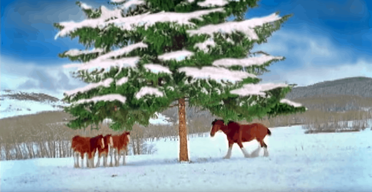 The commercial starts off showing two separate groups of Clydesdales standing on either side of the single tree in a snow-covered field. Just a beautiful Christmas scene. But it all starts when one horse decides to kick a snowball over at the other group.