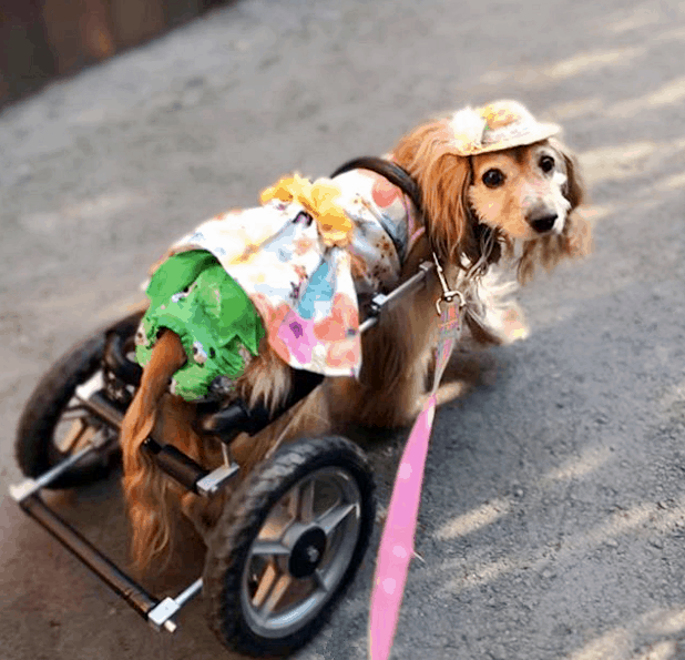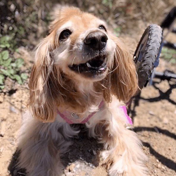 Violet, a paralyzed Cocker Spaniel who resides with a foster through Camp Cocker Rescue in Los Angeles, depends on her custom wheelchair in order to get around.