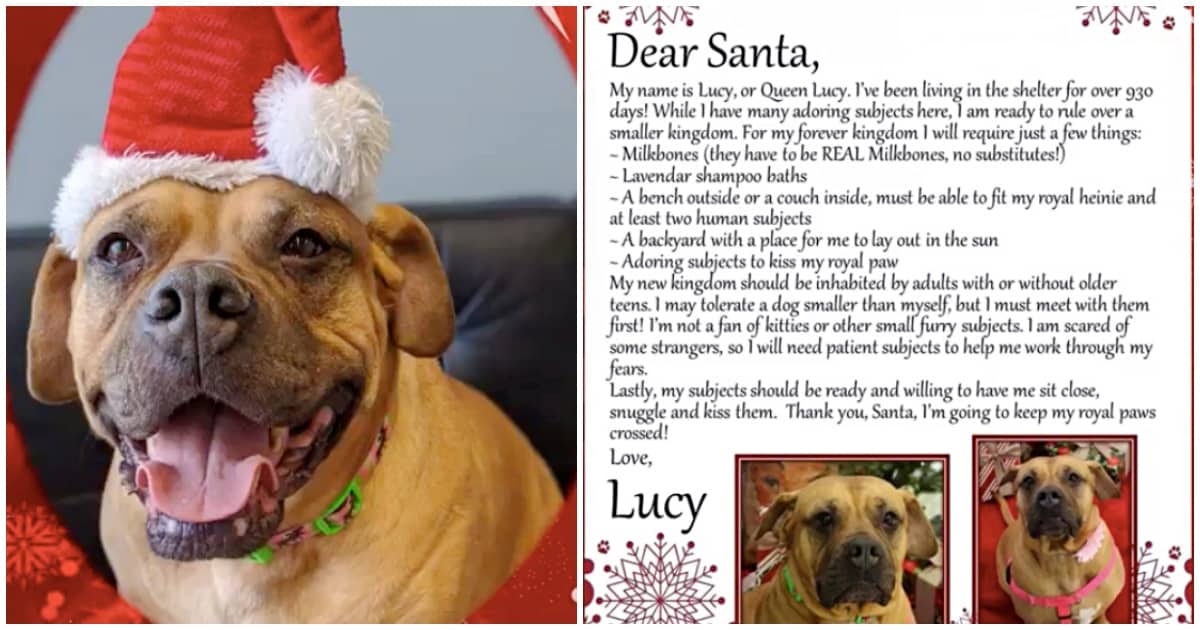The SPCA wrote a letter to Santa from Lucy that explained to him her one and only Christmas wish: to find a forever home. Santa then came to the SPCA to meet her, and she was beyond ecstatic. As soon as she saw Santa standing there, she ran toward him, wagging her tail. Then she jumped up on him to give him kisses.