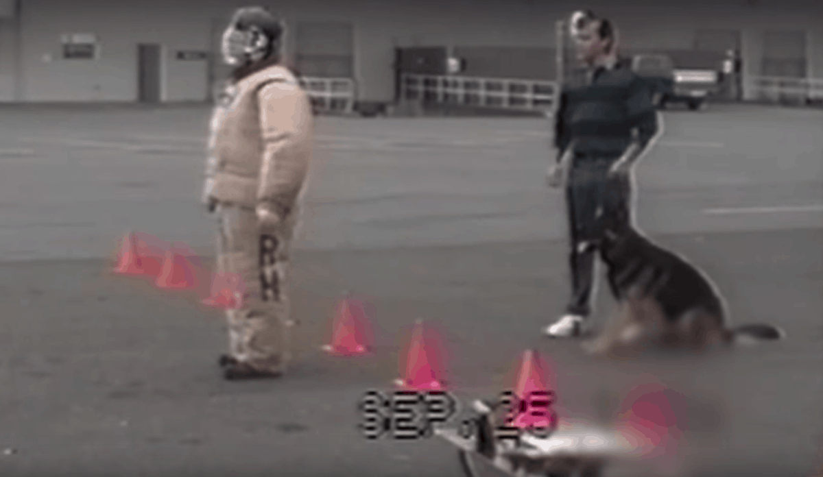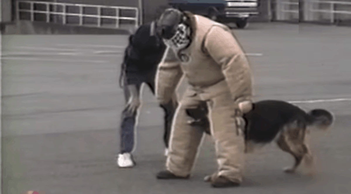 The dog does his job and attacks the “bad guy,” but this is where he spices it up just a bit. The trainer tells the dog to release and stand still, and the German Shepherd does exactly that — just in his own goofy way!
