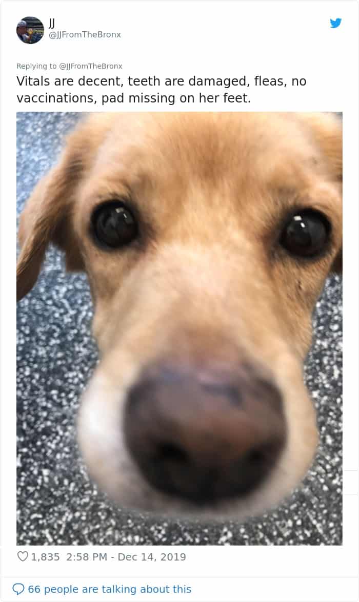 When Jack found the dog, he realized that she needs urgent help and took her to the vet. It was confirmed that the 8-year-old stray has no chip, is severely malnourished and injured. “Suzy has a heart murmur, hook worn, infected paws, pad damage and atrophy in one of the legs from it being so damaged. She needs a bunch of dental work but is very underweight so we need to get her weight up and have some tests to make sure she can be put under for procedures.”