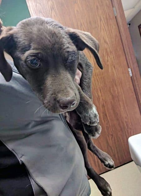 A puppy, now named Tuff, was found in Glenwood City, Wisconsin, with a bullet through one of his eyes and lodged in his neck. He was lying in a ditch where his abuser left him for dead.