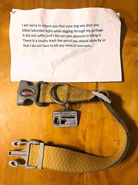The note read: “I am sorry to inform you that your dog was shot and killed Saturday night while digging through my garbage. It did not suffer and I did not take pleasure in killing it. There is a county leash law which you should abide by so that I do not have to kill any more of your pets.”