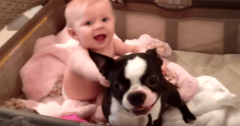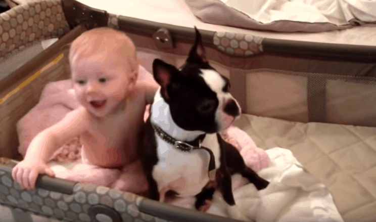 Apparently he heard a “sure, go right ahead,” because the hilarious dog jumps right back onto the bed and from there leaps into the crib. His baby sister, obviously, finds this to be the funniest thing she has ever seen in her short life. And her laughter is absolutely adorable. And happy to be back, the Boston Terrier gives her a big kiss. Soo cute!