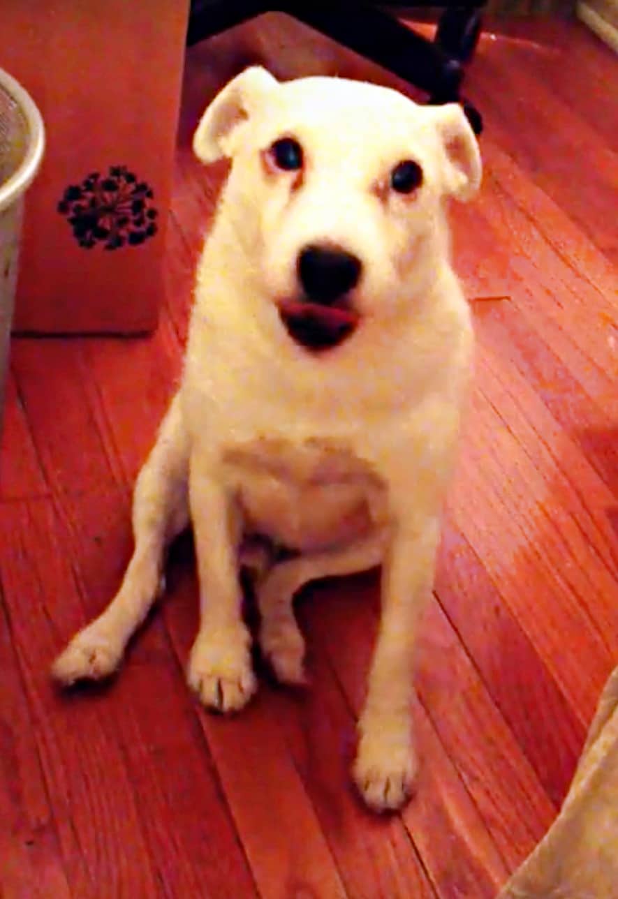His human calls it “slinking” away, and we think it’s the most accurate way of describing his actions. As soon as she starts talking to him, Matzo makes eye contact (a trait not usually seen in guilty dogs) and slowly, very slowly starts pushing himself away from her.