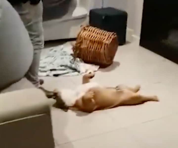 That’s all it takes for the two pooches to get back on their feet. Can’t miss out on those yummy snacks! But as soon as mom questions them about the mess again, back they go on their backs, playing dead! These dogs sure had me giggling at my computer screen!