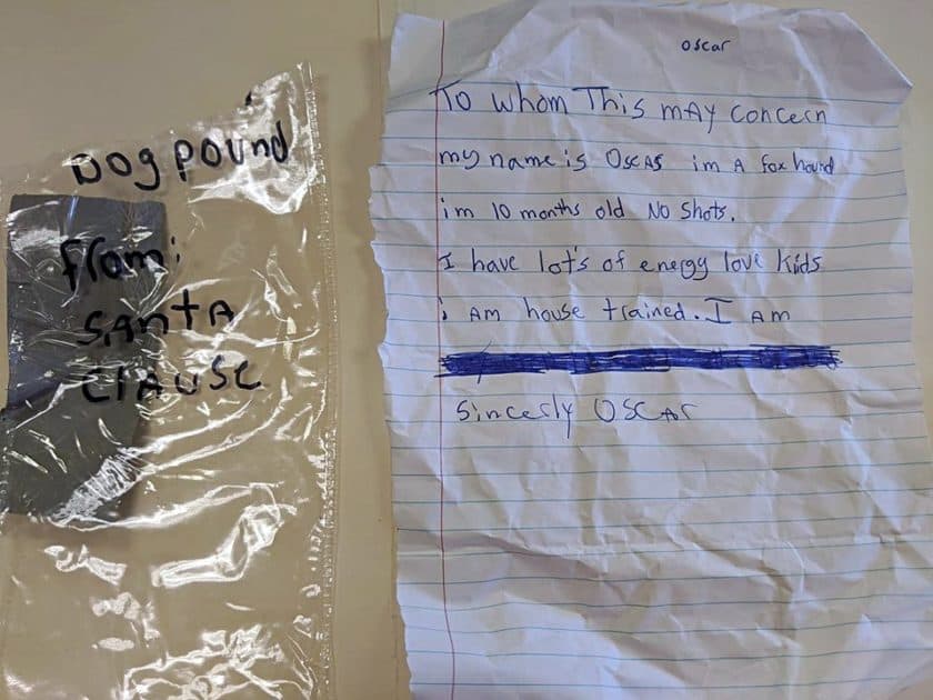 “To whom this may concern. My name is Oscar. I’m a fox hound. I’m 10 months old. No shots. I have lots of energy. Love kids. I am house trained.”