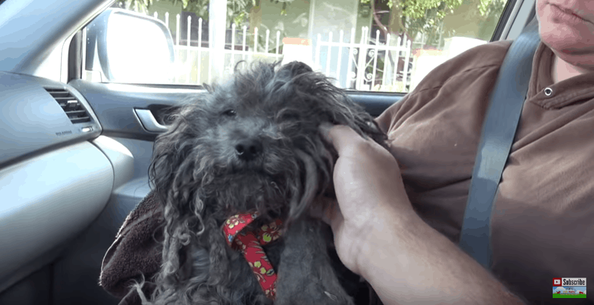 This scared little dog was found under a trailer by the good people at Hope for Paws. He had been abandoned for over a year and was clearly in poor shape. And terrified of humans! His yelps of fright and panic are enough to break your heart… but it takes just a few pats and kind words to calm him down.