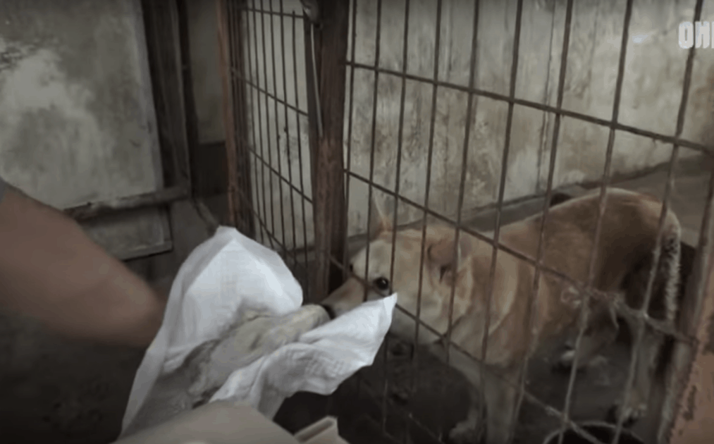 In this particular story, a mama dog gave birth to a litter of pups at a dog meat farm that was being monitored by officials. The advocacy group heard about Mama and went to check out the situation. The mama had refused her own pups and they lay there dying.