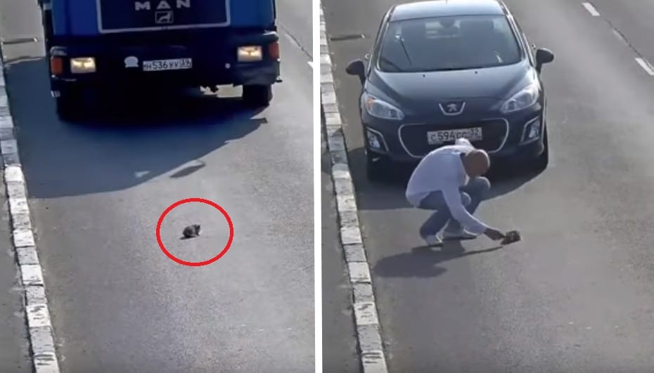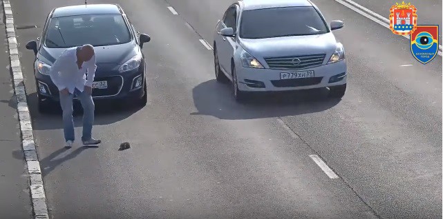 But this is when humanity is displayed at its best, a man stops, gets out of the car and bravely walks onto the busy road, grab the tiny kitten and saves her life.