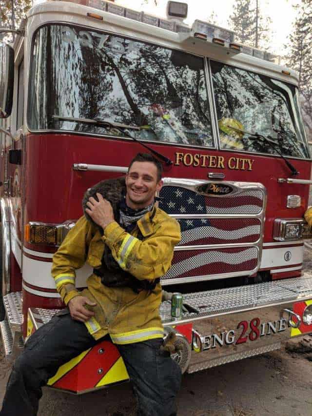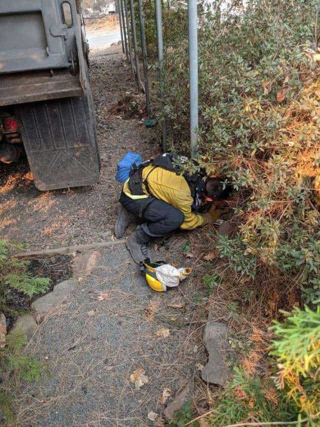 On Monday, while patrolling areas affected by the Camp Fire that were evacuated due to massive blaze, a crew from the Foster City Fire Department heard a sound they could not ignore — the desperate cries of a creature holed up under a bush.