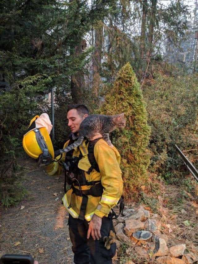 Firefighter Geoff Downing was able to coax the cat from his hiding spot, taking him warmly into his arm. In that moment, the rescuer and rescuee shared the same feelings of relief and joy.