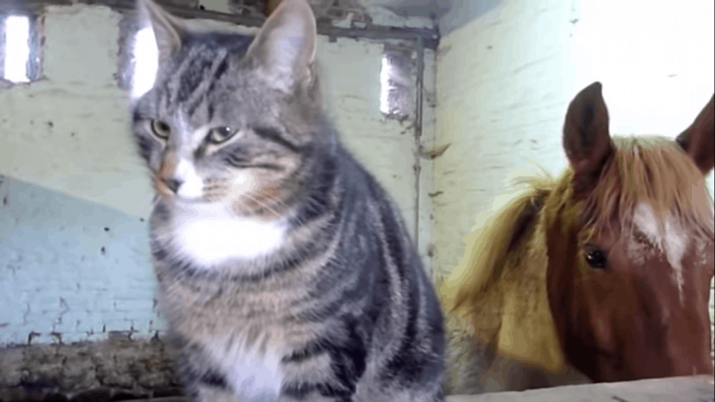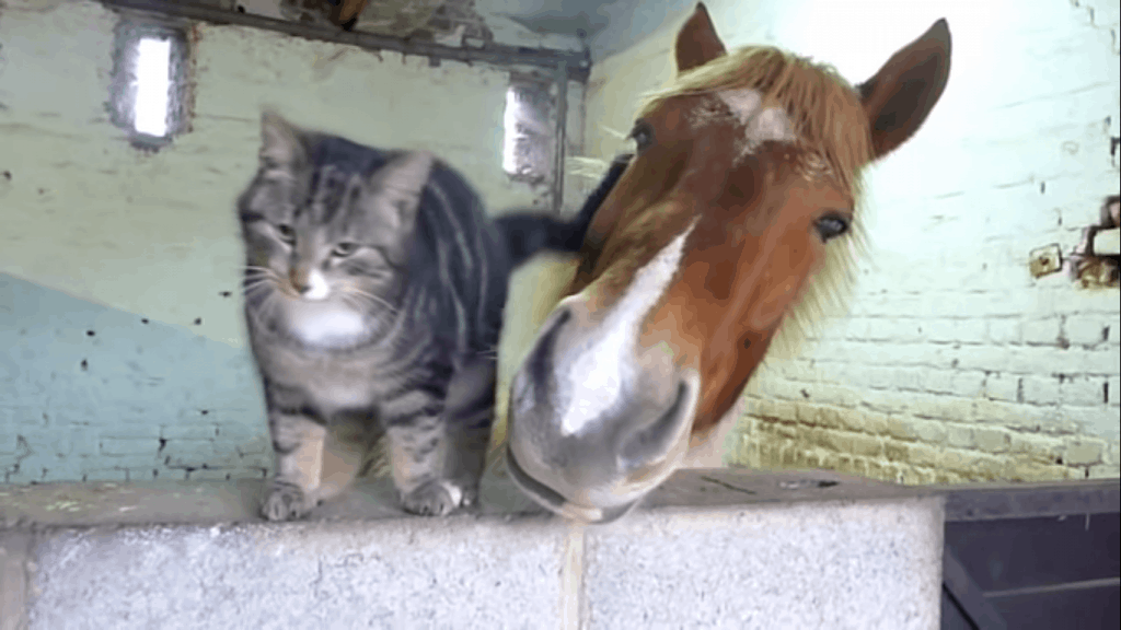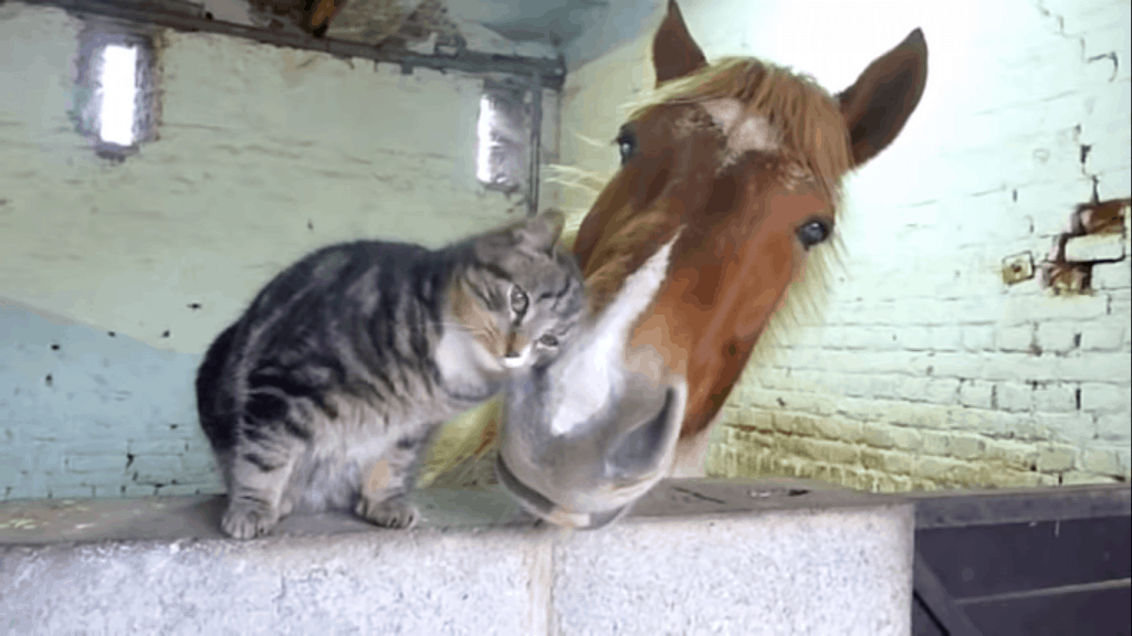 An affectionate cat has a friendly visit with a horse in the barn. She finds a way to get up close to the horse so she can nuzzle and cuddle with her new friend!