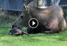 Momma Moose Is Busy Grooming Her Newborn Baby, But Watch What Appears Behind Her