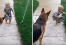 German Shepherd Is Terrified Of New Sprinkler – Toddler Steps In And Helps Him...
