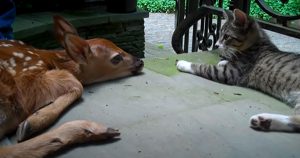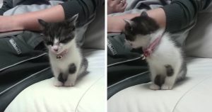 The kitten was obviously too tired to wait for his dad to finish working so what happens? Well, little by little, the kitty begins to do what all kitties do best – doze off!