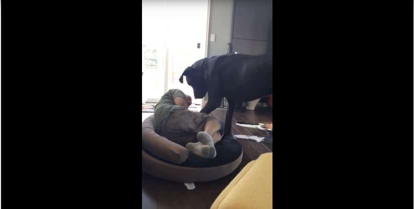 Knowing how Henry hates when someone goes near his plush pillow, his human daddy tries to pull a prank on him by pretending to be taking a nap in his bed. Once Henry spots the intruder, he immediately tries to address the matter by “telling” him to get out of there. The dad acts as though he doesn’t understand what the giant dog has to “say” so Henry decides to use his paw in order to tell his daddy he is not really welcome and how he should find his own favorite spot.
