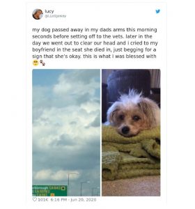 But then, she looked up into the clouds… and saw her dog’s face. “I was crying my eyes out and I looked up in the sky and saw Sunny.” However, Lucy isn’t the only person who saw their former pets in the sky—other owners shared their stories on the internet after seeing Lucy’s post.