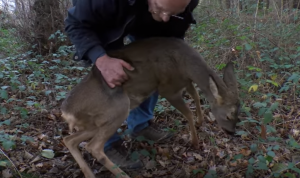 A deer can die of capture myopathy when too stressed. For that reason, Emma, our vet, quickly stitched the wounds and rushed back with Simon to where the deer was found. Once in the woods, the deer was struggling to stand up and was showing no will to live. After a lot of effort from Simon to keep her up, she managed to stand on her own, but failed to take her first steps…