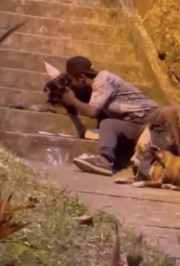 “He is “Choco”, a street dweller from #Bucaramanga,” the person who filmed the moment, wrote. “He has always been seen accompanied by his furry ones. It is for people like him that we must change this unjust society.”
