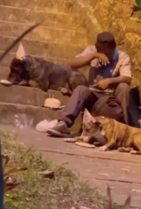 Choco might live on the streets, but he still has a family. A really loving one: his two adorable dogs who never leave his side. They are inseparable and have a deep love for each other. So when one of the dogs, named Shaggy, turned 2 years old, Choco had a lovely surprise for him. He just bought a cake, birthday candles, and even party hats, for a proper celebration.