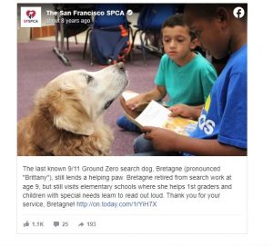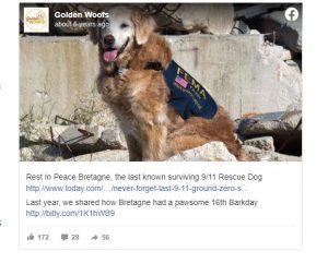 Last year, Bretagne was recognized as the last surviving canine responder in the aftermath of 9/11. On the 14th anniversary of that sad day, her face then clearly touched by time, Bretagne returned to the site of Ground Zero to pay tribute to those who were lost.