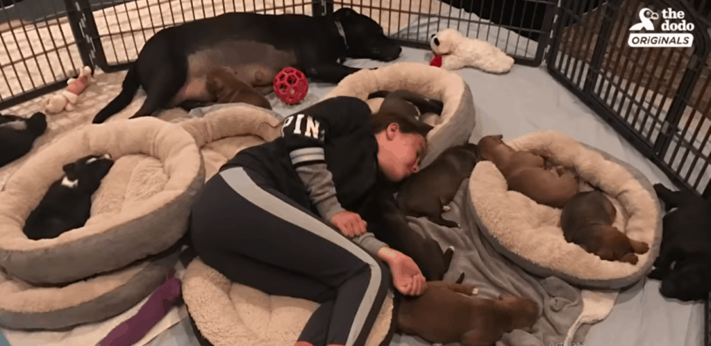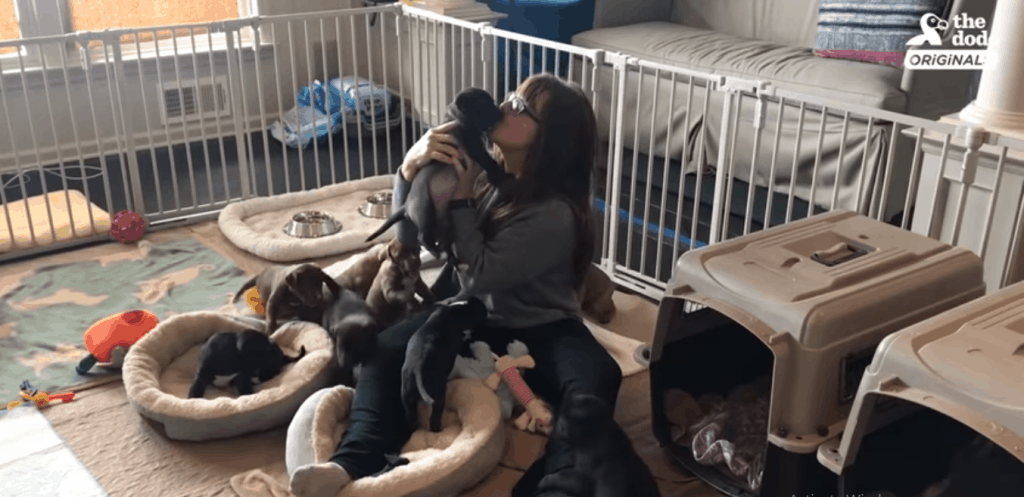 A beautiful black dog named Bess was found wandering around the streets of Tennessee, incredibly pregnant, miserable and lonely. Tracey and Jon Stewart saw her and couldn’t bear to leave her, so they rescued her and headed to the animal emergency room. It’s a good thing they did because she was in the throes of labour with 12 puppies and enduring labour difficulties. The smallest puppy in the large litter was blocking the birth canal and had received limited oxygen for three hours.