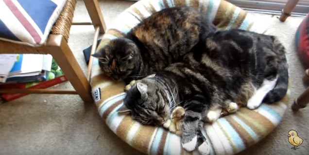 These two cats in the video are named Oscar and Rosie. And Oscar and Rosie are sleeping and snuggling together with a lot of fluffy chicks! This video definitely brightened my day. I always thought a cat would eat a chick the first chance he got! But I was so wrong!